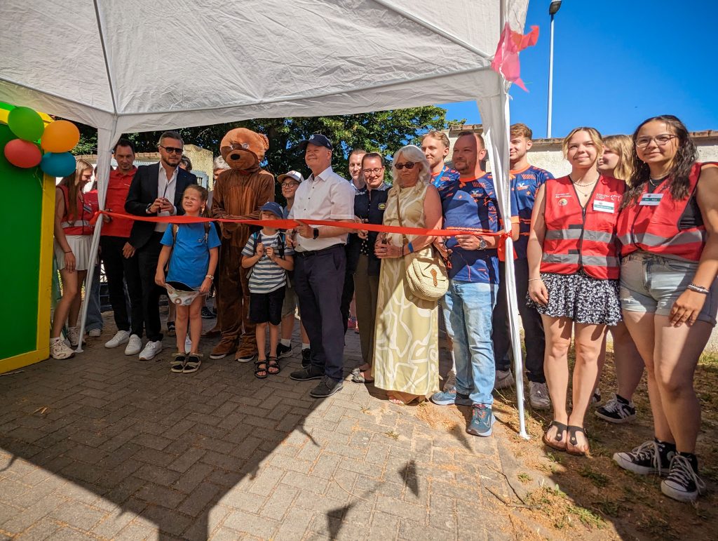 Die feierliche Eröffnung wurde von Herrn Mike Keune, dem Vorstandsvorsitzenden der Stiftung Evangelische Jugendhilfe gemeinsam mit Paul Koller, dem stellvertretenden Oberbürgermeister der Stadt Bernburg, sowie zahlreichen Vertreter*innen der Sponsoren vorgenommen. Gemeinsam mit dem Maskottchen-Bären zerschnitten sie das rote Band und öffneten die Tore.